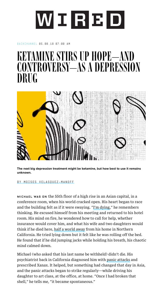 In addition, I have also participated in trainings by The Ketamine Training Center in which ketamine, ordinarily used as an anesthetic for children and in veterinary medicine, has an off-label use of providing a mild euphoric effect stimulating both biological and psychological alternatives to depressive thought patterns. The work of integrating this compound into a traditional practice of providing psychotherapy is quite promising as this recent article in Wired magazine explores: